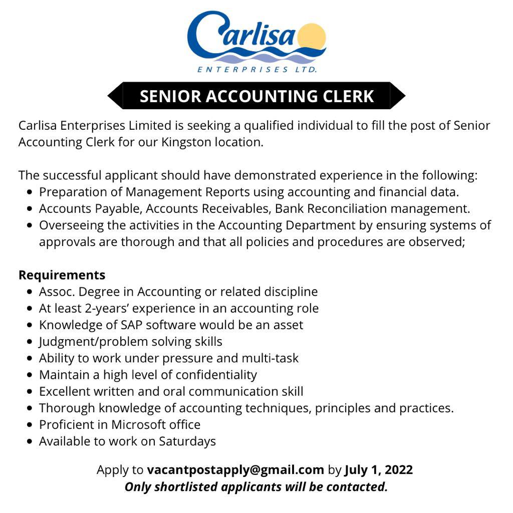 Rated 1 Job Site. Qualified individuals to fill the position of Revenue Junior Accounting Clerk. Apply for Accounting Jobs in Kingston Jamaica.